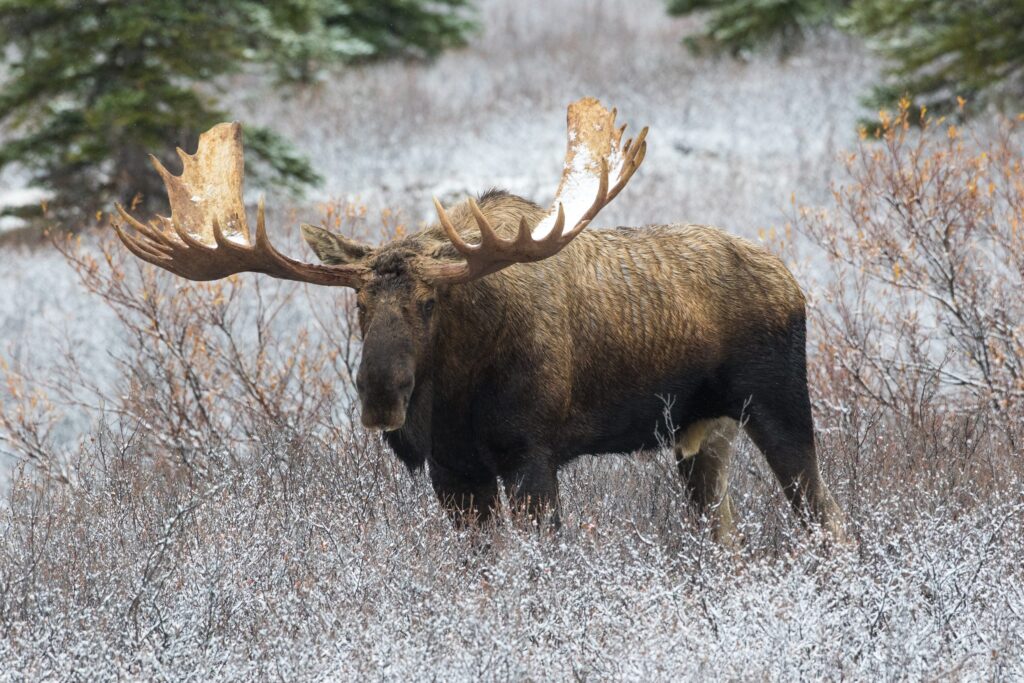 A 70 plus inch bull moose looks over his terrain. He was actively mating a cow moose. A large bull like this can hit 1800 lbs. Biggest I have ever seen. Taken at Denali National Park, Alaska