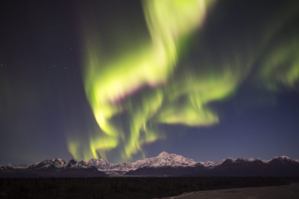 A beautiful aurora dances over Denali. Taken near Trapper Creek, there was a full moon out that night that illuminated Denali. The aurora had to be strong to fight the light of the moon.