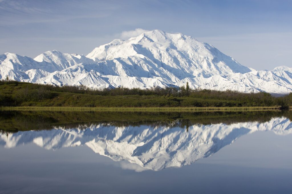 A mirror reflection of Denali, taken at the world famous Reflection Pond in Denali National Park, Alaska.