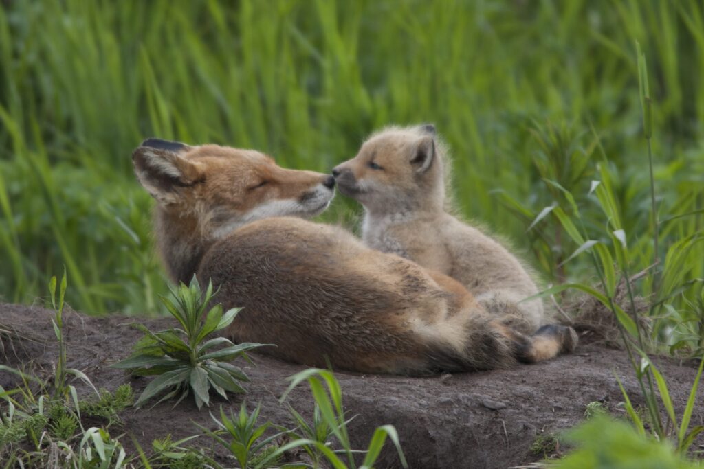 A red fox vixen and her new kit exchange nose kisses. Foxes are affectionate creatures and enjoy bonding. Photo taken at McNeil River Game Sanctuary. World famous for brown bears but it also has foxes and other critters visiting.