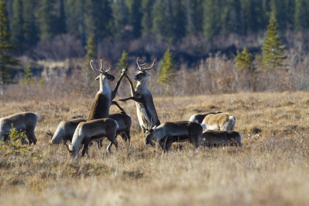 Two caribou cows appear to share a high five. Actually this is a momentary tiff between them, a pecking order dispute. Photo taken in Kobuk Valley National Park, near the world famous Onion Portage. It was a split second moment.