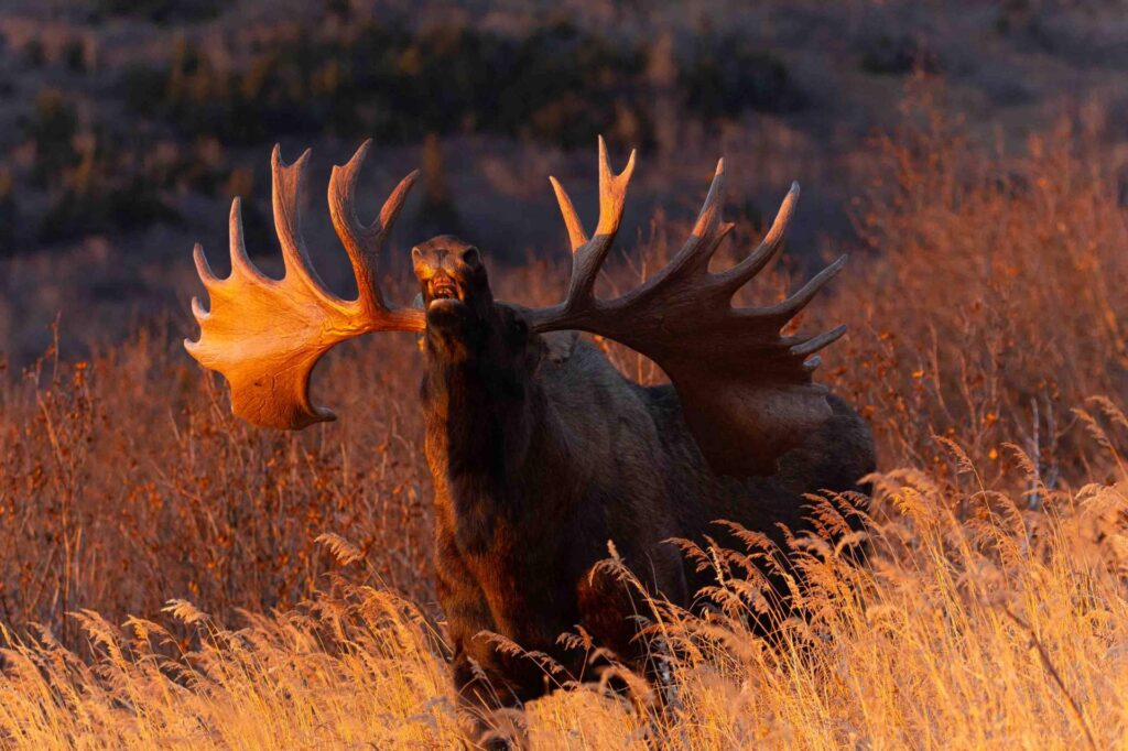 I waited over 2 hours while this alpha bull was laying down with his harem of cows. As the minutes and light ticked away it seemed that the bull would never stand up. Finally one of the cows got up and walked by and this stirred him to stand and pose. There was less than 1 minute left of sunset light when this happened. Powerline Pass, Chugach State Park