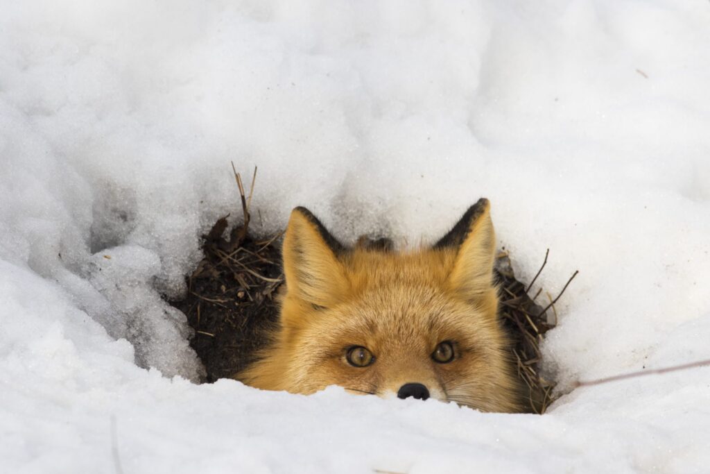 A red fox vixen peeks it’s head out of its winter den,,,in this case, a drain culvert. Taken on Campbell Creek in Anchorage, Alaska.