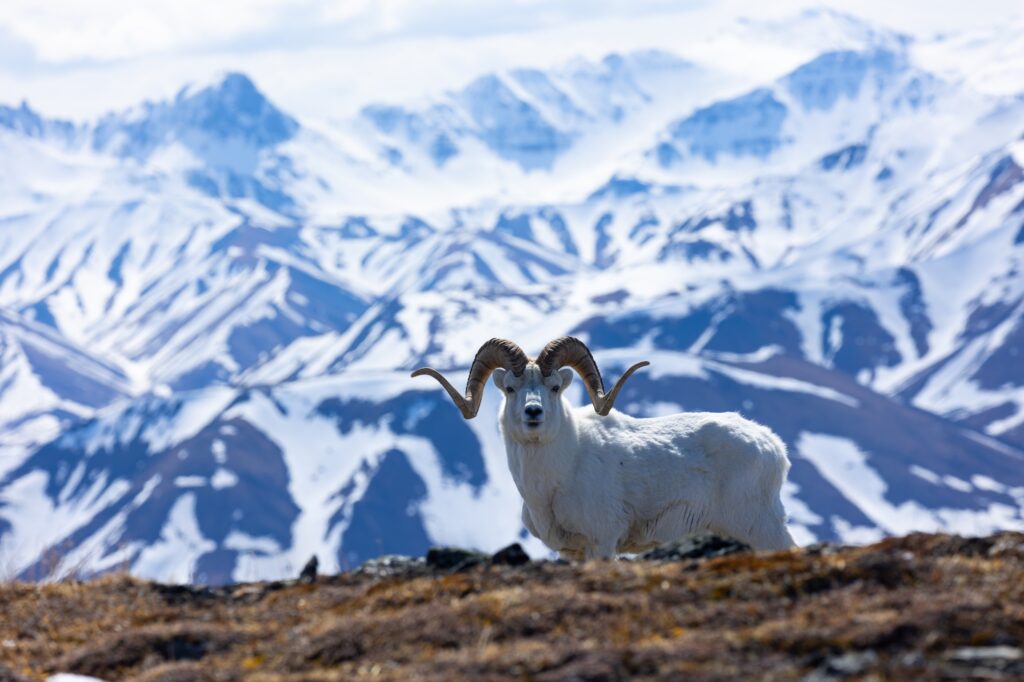 A place where full curl rams go and the people who chase them. This full curl plus Dall Sheep ram stands regally with the Alaska range in the backdrop. Taken in May, Denali National Park.