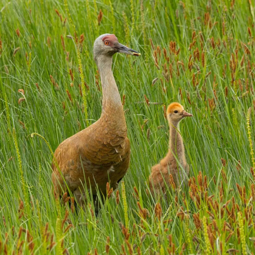 A parent Sandhill Crane watches over its young one, called a colt. Eagles and foxes are their main enemies and the cranes have to keep a sharp eye out to protect them. Anchorage Coastal Refuge.