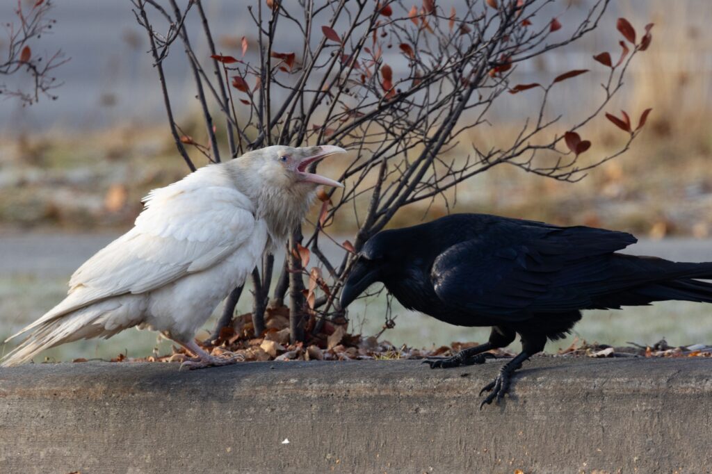 A very rare white raven and its black sibling interact. It is not Albino, but rather Leucistic. Leucistic birds can show some or all pigmant changes. This one has blue eyes instead of the pink eyes of an Albino bird. White ravens only happen 1 in every 30,000 plus ravens, making it quite rare. Anchorage